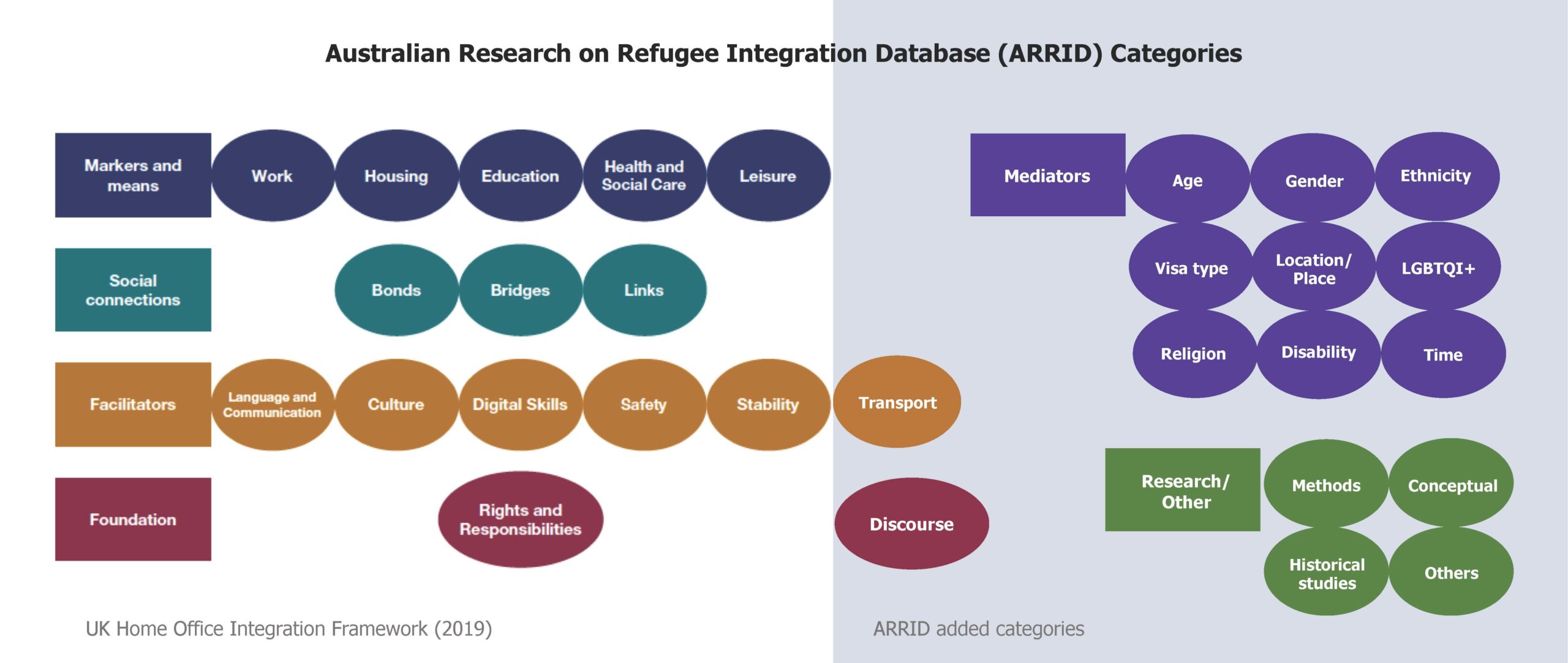 The categories used in the ARRID database were defined drawing extensively on the domains of integration originally developed by Alastair Ager and Alison Strang in 2008 (Understanding Integration: A Conceptual Framework) and revised into the UK Home Office Indicators of Integration framework (2019).