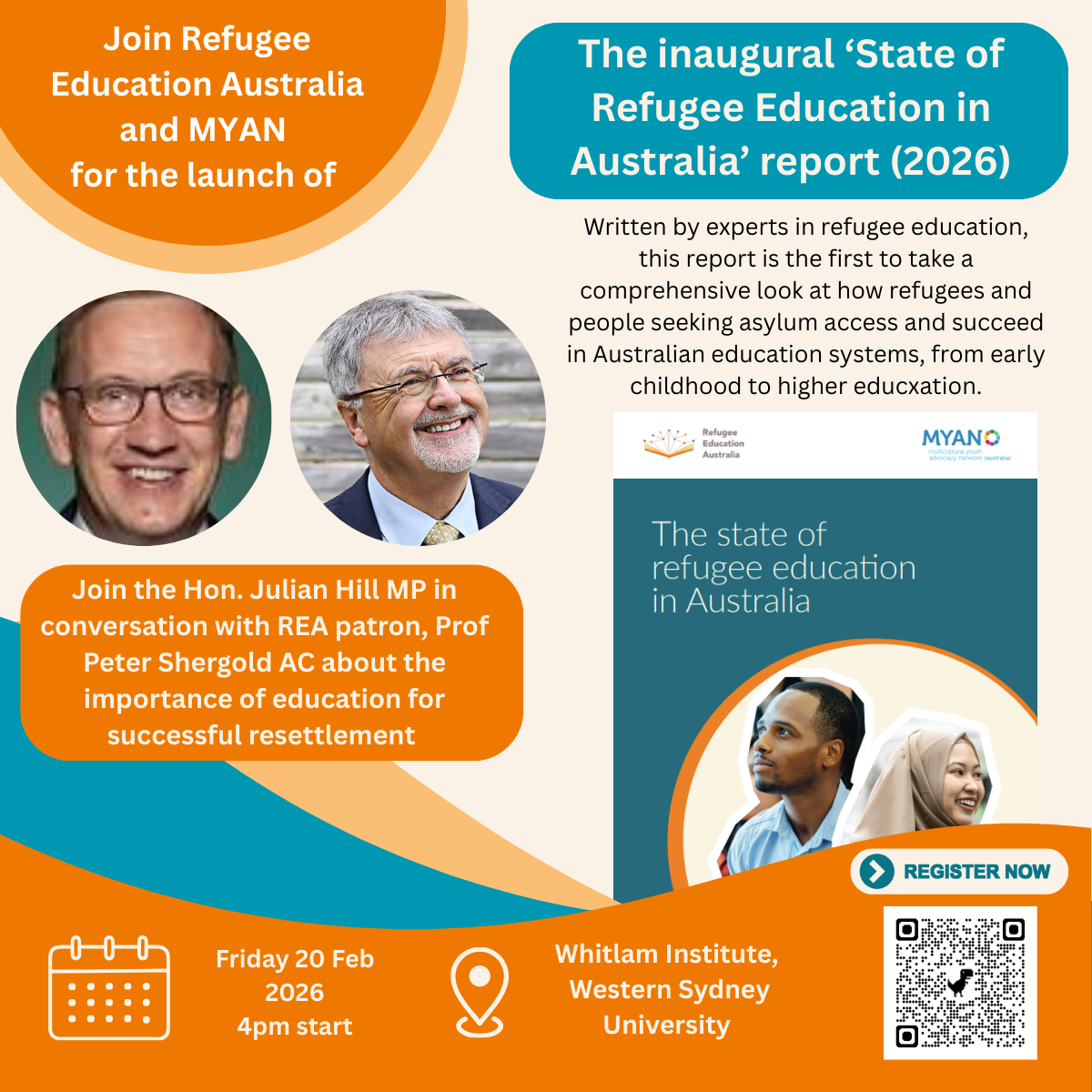 Refugee Education Australia and MYAN are excited to launch this inaugural State of Refugee Education Report (2026) with our generous host – The Whitlam Institute (Western Sydney University) with Minister Julian Hill and our wonderful patron, Professor Peter Shergold (AO).